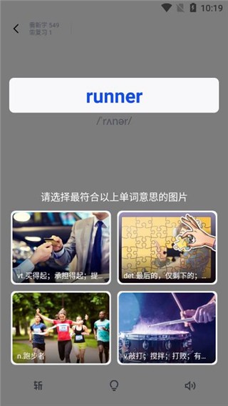 学习界面一键切换“看图识词”“听音选义”“拼写检测”三种模式
