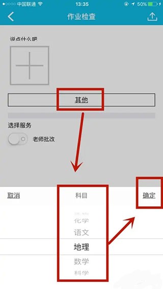 选择需要提交批改的学科,确认后进入作业上传流程。