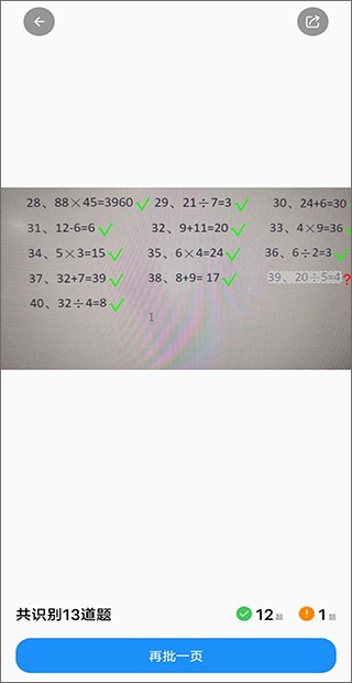 几秒钟后,整页批改结果即时呈现,正确题目标绿,错误题目标红并附带订正提示。多页作业可连续点击“再批一页”,无需重复操作。