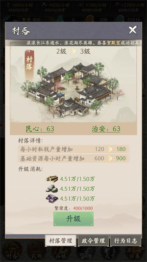 地图中央的聚落建筑支持持续升级,粮仓扩容、兵营扩建、工坊精进,资源产出随治理水平稳步提升。