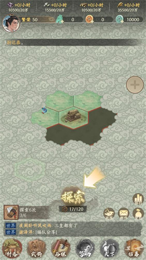 踏上征途后,主界面“探索”是打开世界的第一扇门,轻点即可派遣部队踏足未知疆域。