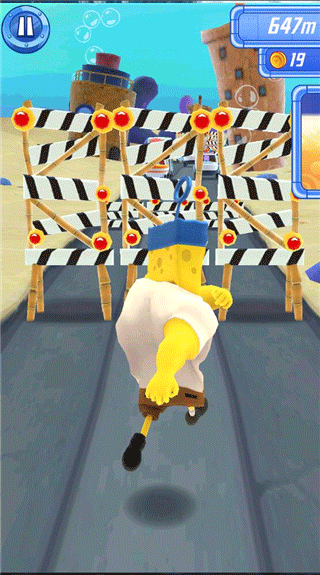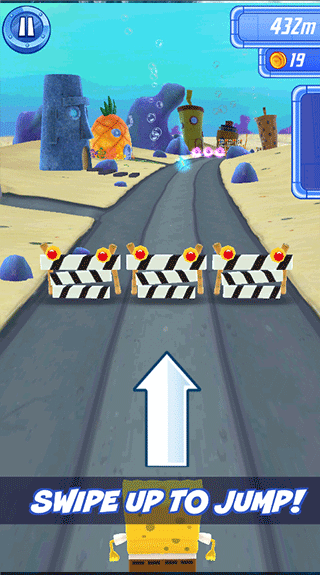 屏幕左右滑动控制海绵宝宝横向位移,灵活绕开迎面而来的障碍物与陷阱。