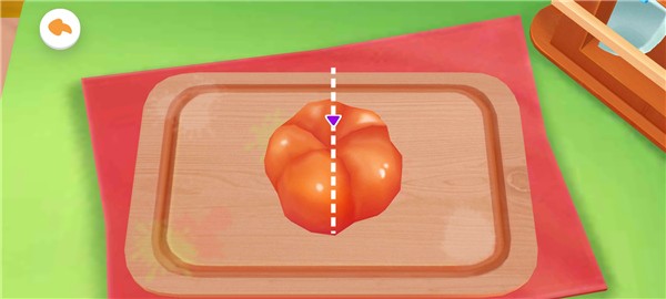 根据提示操作,用手指沿屏幕上的虚线滑动,将西红柿整齐切开。