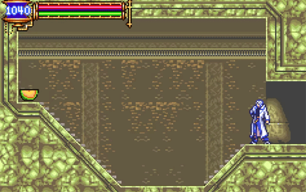 恶魔城藏书库存档点正上方通道尽头向左行进,会发现一堵可破坏的墙,后方藏有蜜瓜。