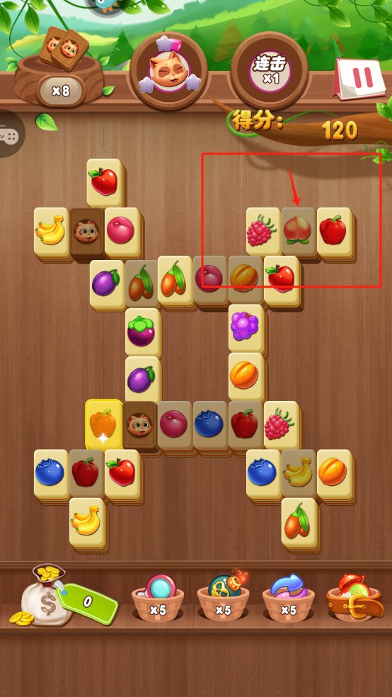 自动高亮显示五组可消除的水果,辅助玩家精准操作。