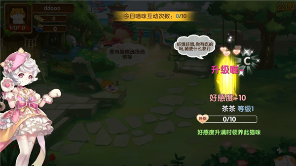 公园里宁静惬意的时光为猫咪提供了舒适的环境,与它们互动后会提升好感度,当好感满级便能顺利领养回家。