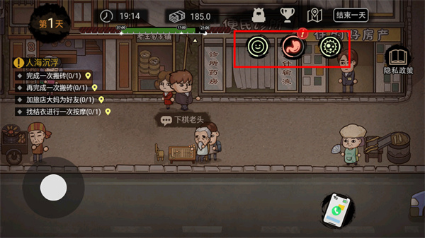 右上角则实时反映角色的身体状态,包括体力、健康等关键指标,这些直接影响你的工作能力和生活质量。