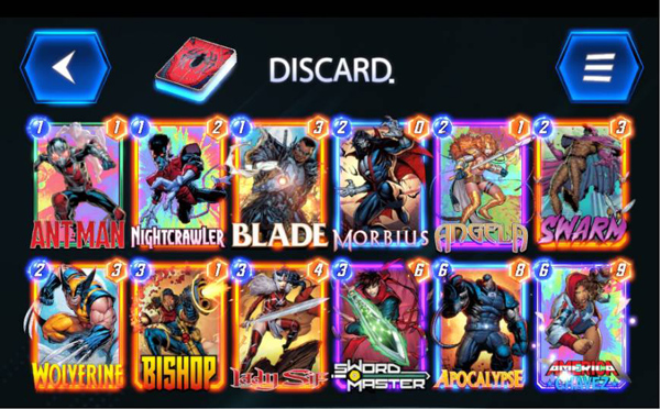 中文卡表:蚁人、夜行者、刀锋战士、莫比亚斯、安吉拉、蜂群、金刚狼、毕肖普、西芙女士、剑仙、天启、阿美莉卡