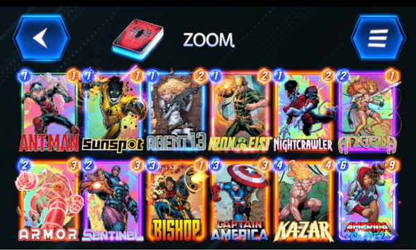 中文卡表:13号特工、曼蒂斯、收藏家、电索、凯、哨兵、神奇先生、美国队长、月亮女孩、白皇后、恶魔恐龙、狂攻
