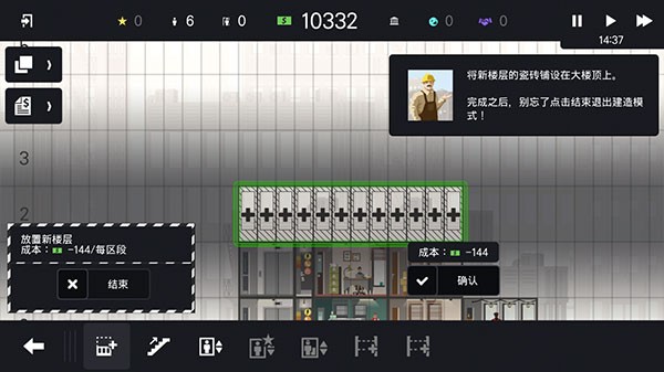 完成当前楼层建设后,点击指定位置并向右滑动屏幕,即可开始新建更高楼层。