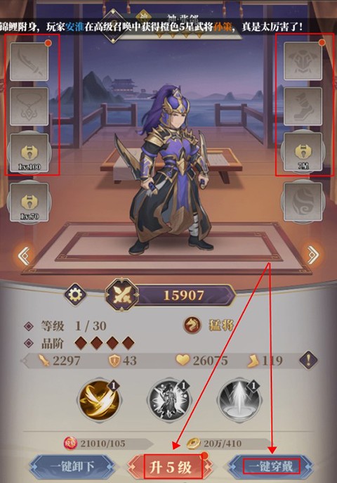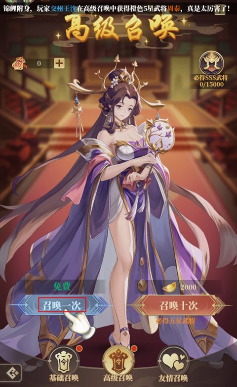 进入游戏后可立即使用免费召唤券,召唤一位强力武将加入队伍,助你开启征战之路。