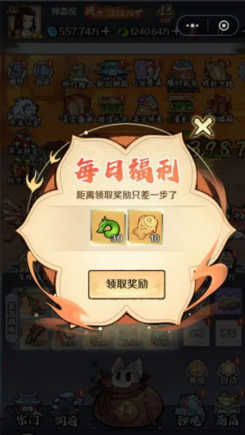 保持在线一定时长后,主界面会浮现飘动的红包图标,点击即可领取当日福利。每天最多可领取五次,每次包含30仙玉与10个小鱼干,记得及时收取。