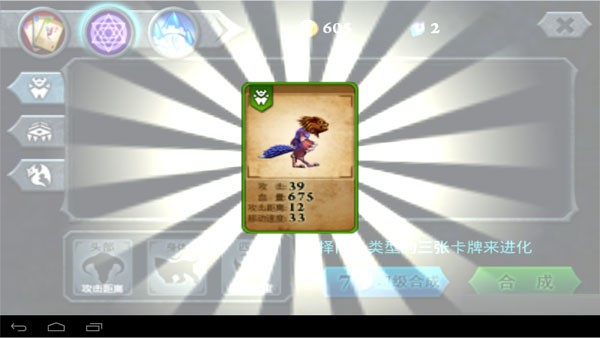 点击界面上方的多面体紫球进入合成界面。左侧三个选项卡分别对应直立行走类、爬行类与飞行动物。每次合成需至少三只同类型动物,比如选择两只老虎与一只犀牛进行组合。