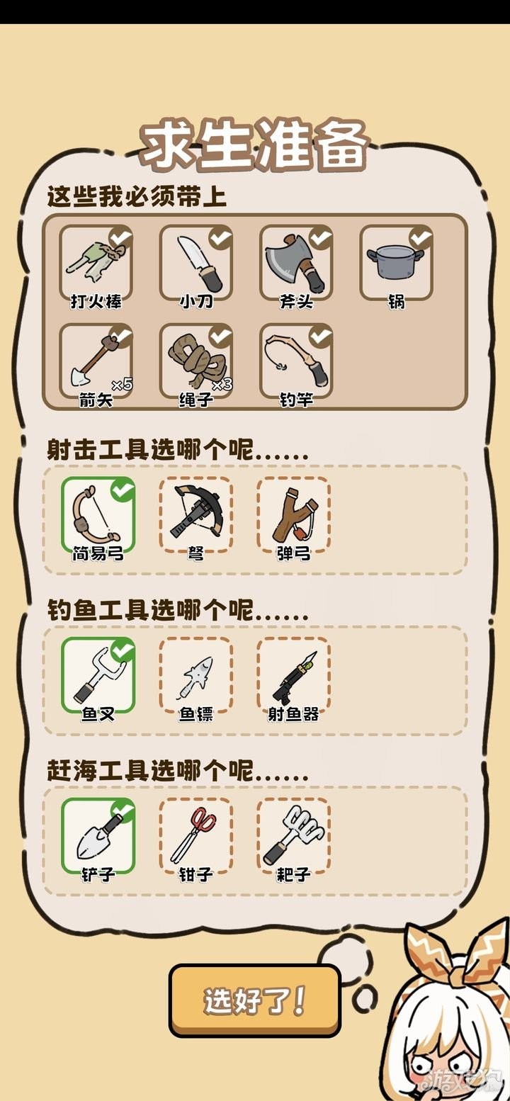 开局建议选择简易弓、鱼叉和铲子作为初始装备,提升早期生存能力。