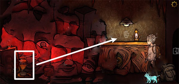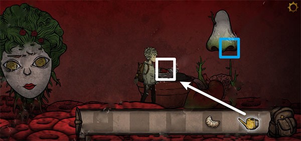 将玫瑰花交给那位女性角色后,进入她的口中,在白色框位置拾取一台机器。把蚕蛹放入机器中加工,产出绿色燃料,随后将燃料注入右侧灯具,点亮发光灯。