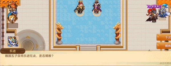第二层为圆阵,破阵口诀“声东击西,南辕北辙”。先与右侧角色对话,随后依次前往左侧、北方,最后攻击中央目标。