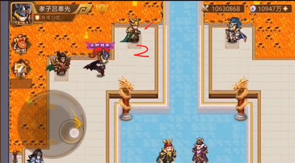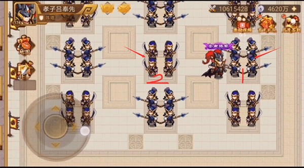 兵阵塔第一层为方阵,破阵语提示“厚方薄中,穴在东方”,按图示位置发起攻击即可顺利通关。