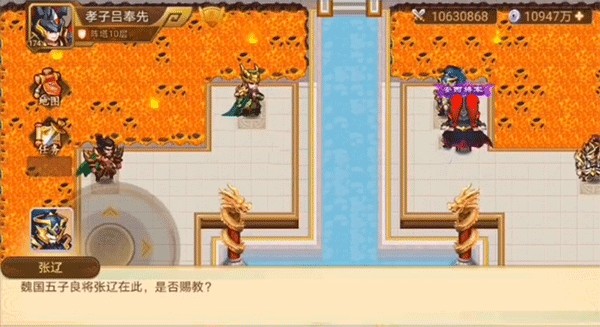 第十层为十面埋伏阵,破阵语“始于胜,亦始于胜”。根据提示依次寻找对应武将:先击败徐晃,其提示“相克于荆州”指向关羽;关羽提示指向于禁;于禁提示“先逝于众人”指向乐进;乐进提示“年长于众人”指向黄忠;黄忠提示“一人止三军”指向张飞;张飞提示“闻名而止哭”指向张辽;张辽提示“曾驰骋于草原”指向赵云;赵云提示“征战一世终惨死”指向张郃;张郃提示“魏王曾避之”指向马超;马超最终提示“征战一世无所依”指向自身,至此兵阵塔挑战完成。