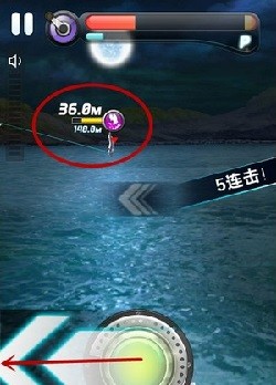 鱼跳出水面瞬间应果断拽线,即按住鱼竿按钮沿箭头方向滑动,借此大幅缩短鱼的距离,避免因游动过远导致断线。