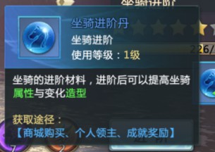 常用升阶材料为“坐骑进阶丹”,可通过商城低价购入或完成任务获取。