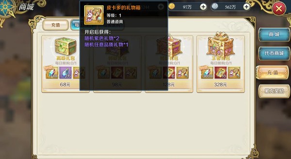 每日限购商品中的【皮卡多的礼物箱】内含友好度道具,打开即可直接使用。