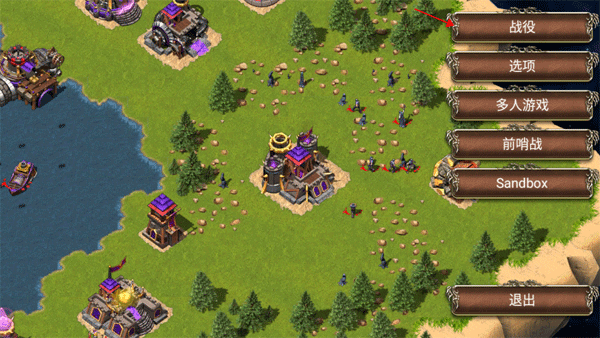 游戏右侧设有多个功能选项,首先点击顶部的“战役”入口开始冒险。