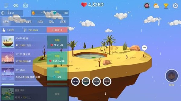 游戏中你还可以升级这片绿洲,让你的小小绿洲在你的精心维护下,变得生机盎然。