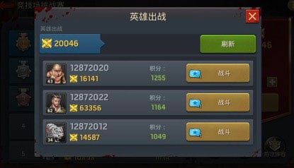 点击战斗按钮后,系统将根据当前积分匹配三位对手供选择,界面会显示对方阵容信息及所需挑战券数量。