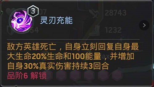 四技能在敌方英雄阵亡时,立即回复100点能量并提升30%真实伤害,进一步加快技能循环节奏,持续维持高压输出状态。