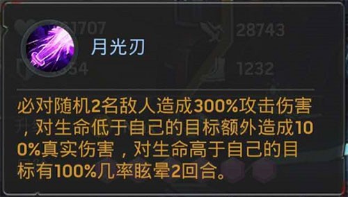 一技能可对随机两名敌人造成高额伤害,若目标血量低于自身,则附加100%真实伤害;若高于自身,则施加100%眩晕效果,攻防兼备,压制力极强。
