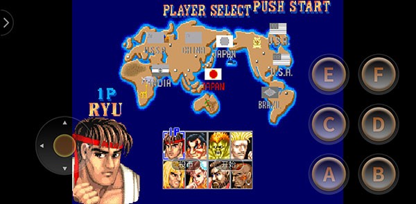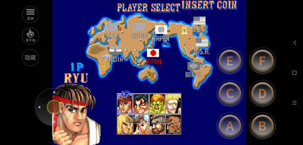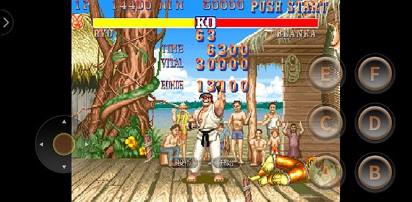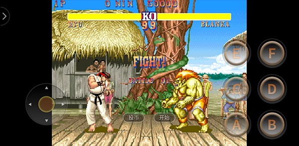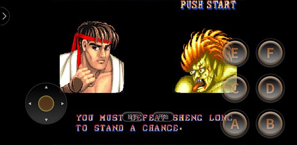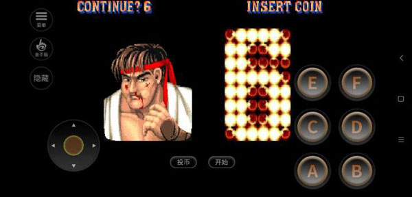 进入街头霸王2汉化版手机版后,先点击“投币”按钮,再按“开始”即可进入游戏主流程。