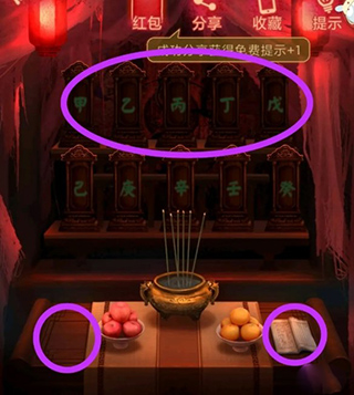 前往右侧破观,贡品桌上有一本书,按书中提示排列牌位顺序。