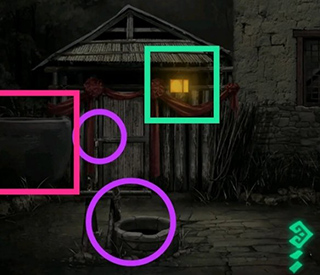 用密码开启房门,取得新道具并安装于水井;留意灯笼提供的线索;粉色方框标注的水缸内藏有虫子。