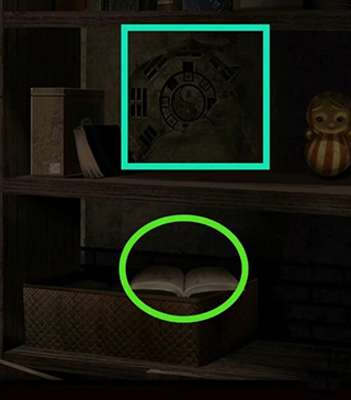 走到右侧书架,第二层放置着阴阳镇,依照灯笼提示开启,取得照片。