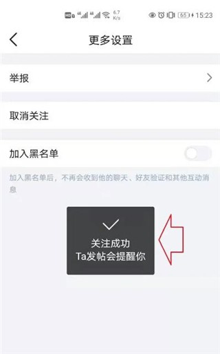 操作成功后会提示“关注成功”,此后对方发帖时你会收到提醒。