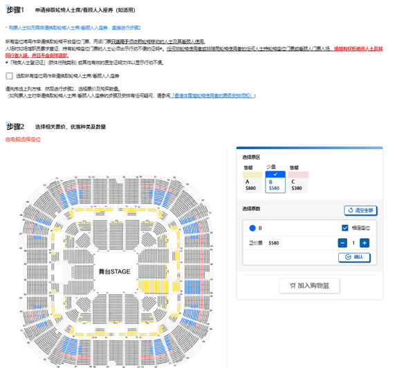 选择你想要购买的场次,并选好座位,加入购物车。页面还可以申请换取轮椅认识席/看顾人入座券,根据自己的需求选择。
