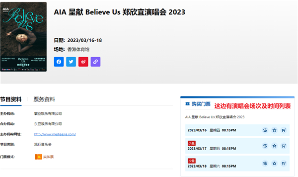 登录账号后,页面会跳转至首页,可以开始你的购票旅程了,选择你需要购票的节目。这里以《AIA 呈献 Believe Us 郑欣宜演唱会 2023》为例。进入具体页面之后,会在右边显示节目时间表及门票剩余情况。