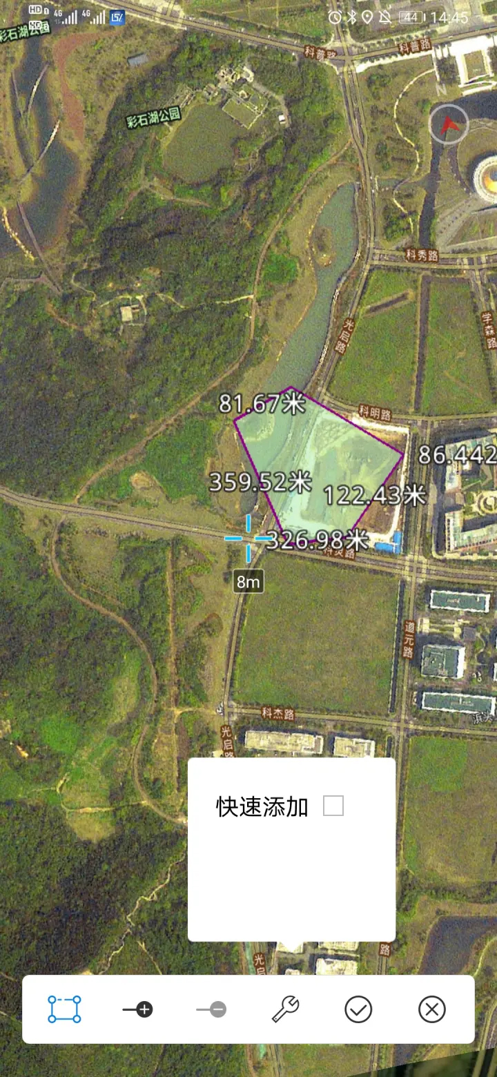 编辑工具栏提供多种空间操作方式:绘制折线定义路径走向,勾勒面域测算面积与周长,调用方位角功能辅助方向判断。测距操作尤为便捷——选定两点后,距离数值与方位角即时呈现于界面顶部,适合现场快速估算目标间距。