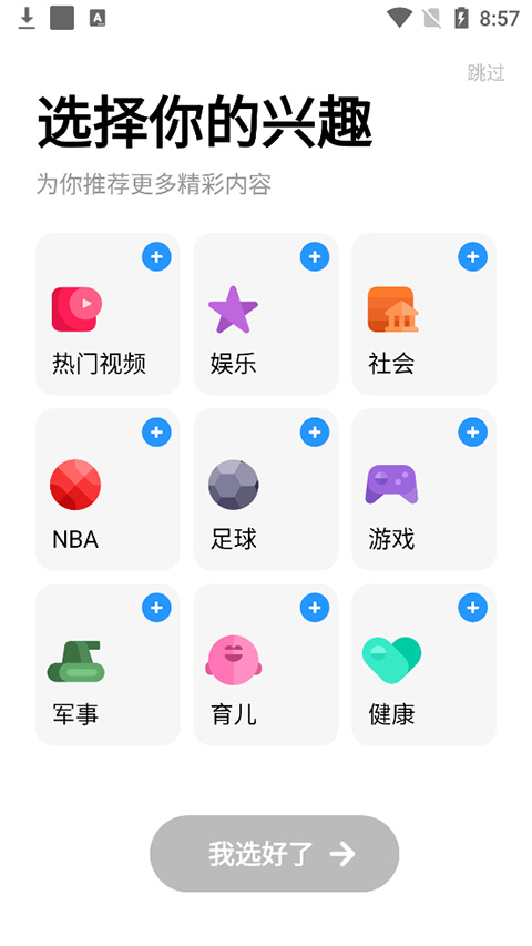 打开应用后,用户可根据个人兴趣选择偏好内容,也可直接点击右上角的【跳过】跳过该步骤。