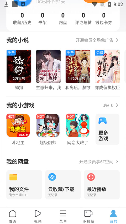 在【我的】页面中,集成了小说阅读、游戏中心、网盘服务等多种实用功能,满足多样化需求。