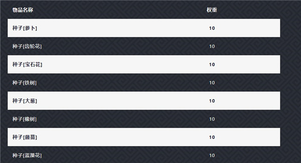特定种子或材料的获取概率计算方式为:其他掉落物基础概率(13%)乘以对应等级概率,再乘以该类型出现概率(35%或50%),最后乘以其自身权重占该类总权重的比例。