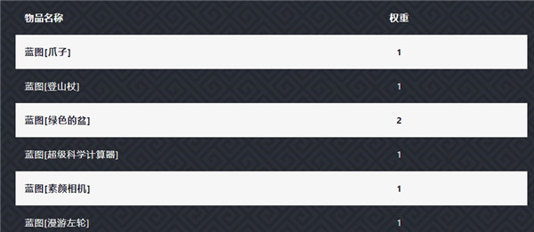 特定蓝图的获取概率则为:13% × 等级概率 × 蓝图出现概率(30%)× 该蓝图权重除以当前等级中未获得蓝图的总权重。