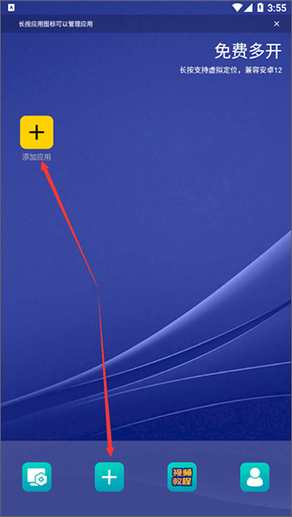 1、打开虚拟双开王App,点击首页的“添加应用”或底部“+”按钮开始添加需要双开的软件;