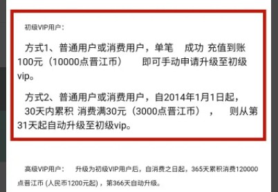页面中会显示成为VIP用户的两种方式:充值10000点晋江币可直接升级为初级VIP,或在30天内累计消费满3000晋江币也可获得相应权限。