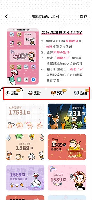在编辑界面中,可以调整组件模板、更换背景、修改文字内容以及添加贴纸等装饰元素。