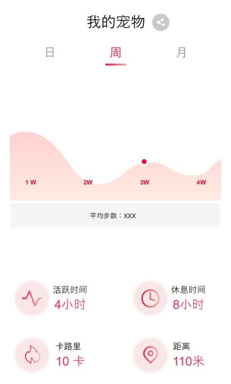 项圈持续采集宠物肢体活动数据,转化为步数、移动距离、能量消耗及活跃/静息时长等可视化指标。系统根据犬猫品种特性与个体体重自动匹配参考阈值,支持自定义日运动目标并生成周期性行为趋势提示。