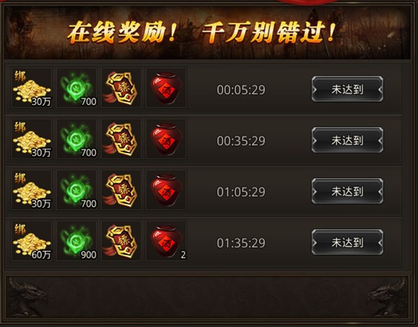 在线奖励根据每日累计在线时长发放,时间越久,奖励越丰厚。