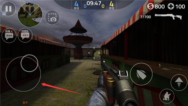 左下角虚拟摇杆控制角色移动方向;