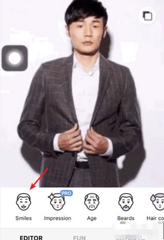 处理完成后,可在底部效果分类中选择如“微笑”等选项进行尝试。