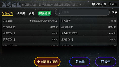 在未配备外设的情况下,用户可借助内置的虚拟按键功能进行游戏操作。点击悬浮球按钮进入“虚拟键盘”,选择对应游戏类型预设方案,或直接搜索游戏名称获取适配布局。